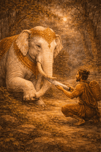 Le Bodhisatta était autrefois un éléphant. Il était entièrement blanc et d’une beauté magnifique. Un troupeau de quatre-vingt mille éléphants le suivait comme chef, mais lorsqu’il découvrit que certains d’entre eux étaient des pécheurs, il partit vivre seul.