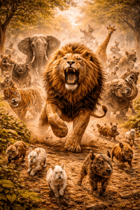 Lorsque le Bodhisatta vit les animaux s’enfuir et apprit la cause de leur fuite, il comprit que la terre ne s’effondrait pas et que ces animaux se précipiteraient sûrement dans l’océan et périraient s’il ne les arrêtait pas. Il courut donc devant eux et les arrêta tous par son rugissement terrifiant.
