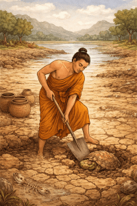 Autrefois, le Bodhisatta était potier. Le lac où il allait chercher son argile était relié à une rivière pendant la saison des pluies, mais lorsque l’eau se retirait durant la saison chaude, le lac et la rivière se séparaient. Les poissons et les tortues possèdent une connaissance mystérieuse du temps et, sachant qu’une sécheresse approchait, ils nagèrent vers la rivière, sauf une tortue obstinée qui ne voulait pas quitter l’endroit où elle était née. Lorsque le lac s’assécha, elle creusa un trou et s’enfouit dans la boue pour attendre le retour des pluies.