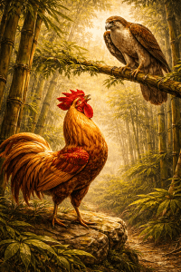 Le Bodhisatta était jadis un coq. Il était le chef d’une grande volée, mais, au fil du temps, un faucon dévora tous les oiseaux sauf lui. Celui-ci voulant également se régaler du Bodhisatta, il devait trouver le moyen de le faire sortir de son bosquet de bambous. Il se percha sur une branche et s’excusa pour ses péchés passés. Il dit ensuite au Bodhisatta qu’il voulait être son ami et l’invita à un dîner dans un endroit où il y avait beaucoup de nourriture. Le Bodhisatta lui répondit qu’ils ne pourraient jamais être amis. Il prononça ensuite un sermon sur l’importance de ne pas s’allier à des personnes malhonnêtes, égoïstes et qui suivent le chemin du mal, afin que toutes les divinités vivant dans la forêt puissent l’entendre. Il proféra ensuite une menace envers le faucon, lui disant qu’il lui ferait du mal s’il ne partait pas, ce qui eut pour effet de faire s’envoler l’oiseau vers un autre endroit.
