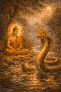 Un jour, le Bouddha fit l’éloge de certains disciples laïcs qui observaient les jours saints et leur raconta cette histoire pour leur montrer que cela pouvait leur apporter de grandes récompenses.