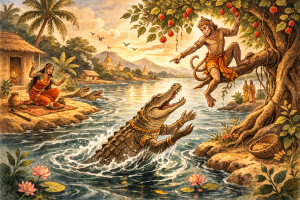 Autrefois, le Bodhisatta était un singe. Un couple de crocodiles vivait non loin de là. La femelle fut prise d’une envie irrésistible de manger le cœur du Bodhisatta et dit à son compagnon de le lui rapporter, sinon elle mourrait. Il promit de le faire et alla parler au Bodhisatta, lui demandant pourquoi il ne mangeait pas les délicieux fruits qui poussaient en abondance de l’autre côté du Gange.